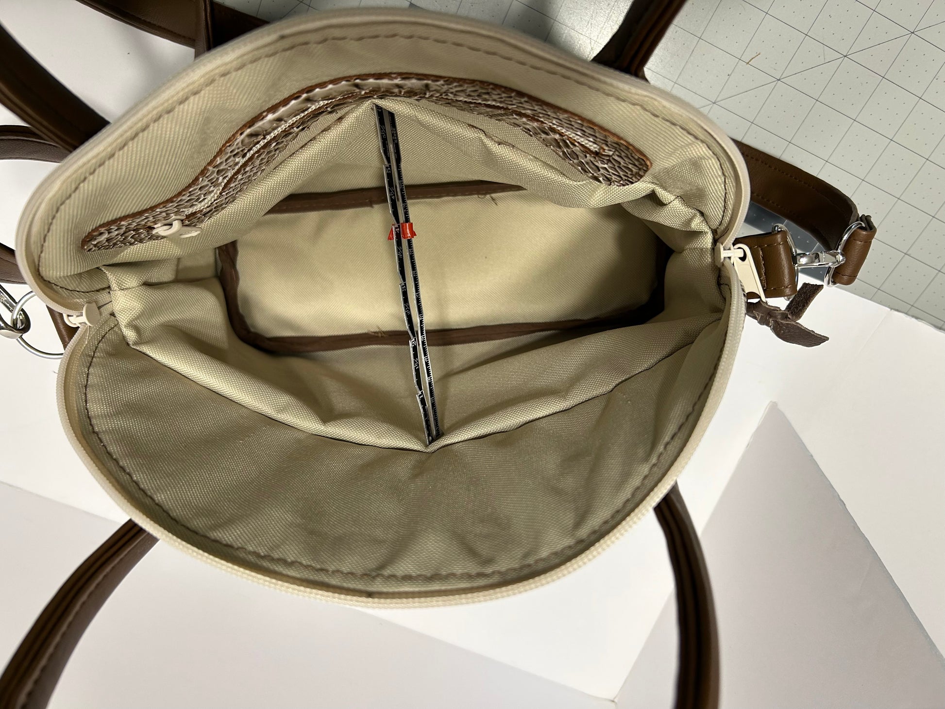This bag features rolled handles and an adjustable cross body strap. The bottom is 4 inches deep with brown marine vinyl. The top is faux beige crocodile with a top zippered closure. The inside water proof canvas lining has a deep zippered pocket.
