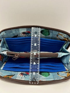 I made this wallet from a brown textured faux leather. It zips around on 3 sides.