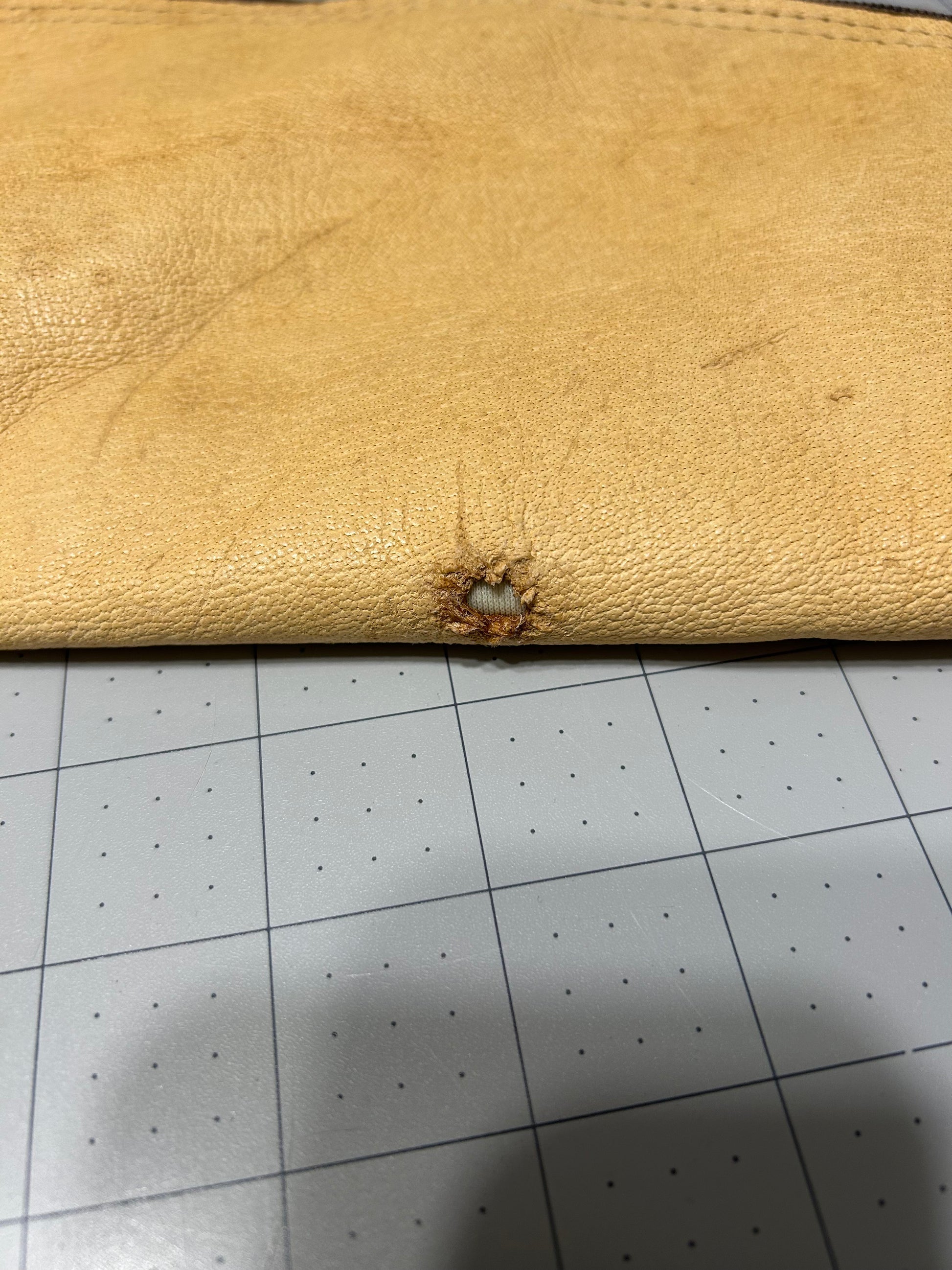 Full disclosure: There is a 45 caliber hole where it was shot and the lining, even though it is glued in, there are places that didn't get stitched around the edges. see pictures