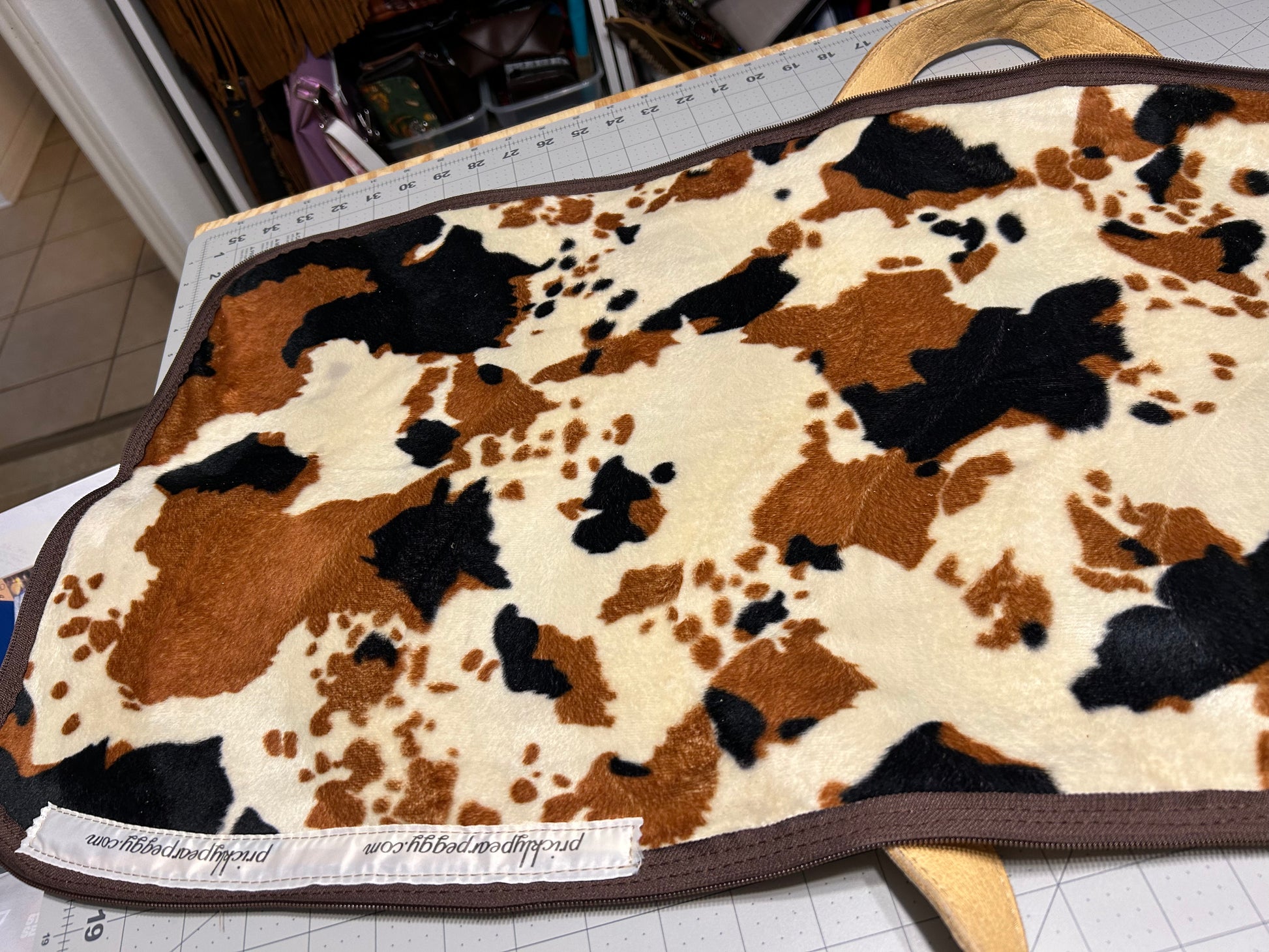 This case is made from African Buffalo leather with a cotton fleece lining. It zips from one end to the other and opens flat. The double leather handles are sewn in as well as riveted with special shot gun shell rivets. It measures almost 60 inches long and 8 1/2 inches as the widest part. Most cowboy action long guns will fit.