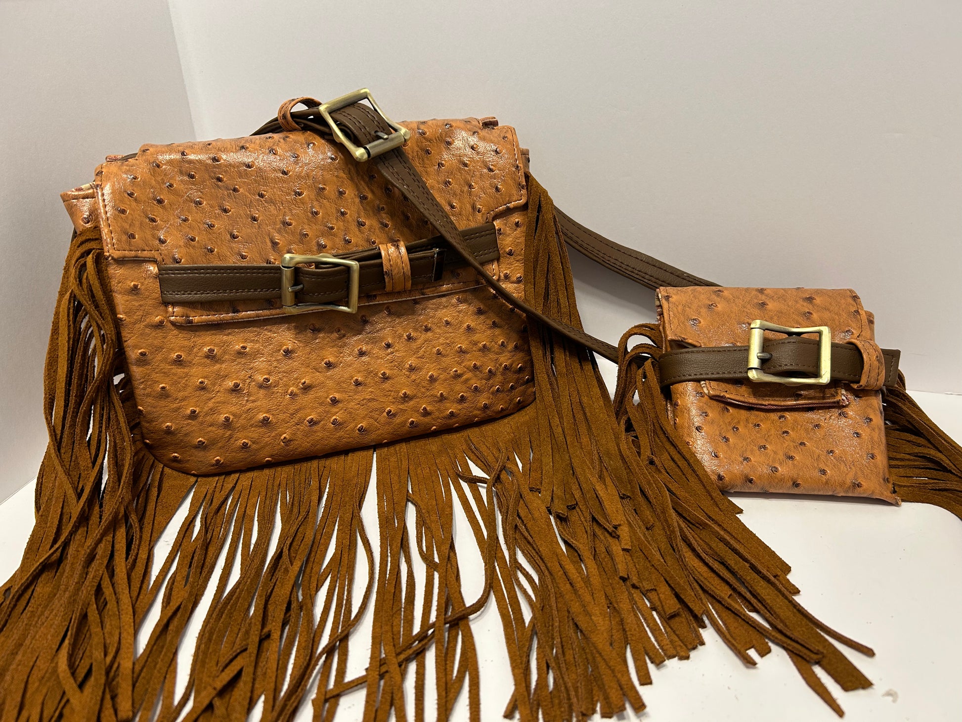 Cross Body bag made from faux leather embossed ostrich. The lining is cotton and features 2 slip pockets. The front flap closes with a magnetic snap. The featured real leather fringe is 8 inches long. The mini matching bag can be worn on the cross body strap or on your own belt around your waist.
