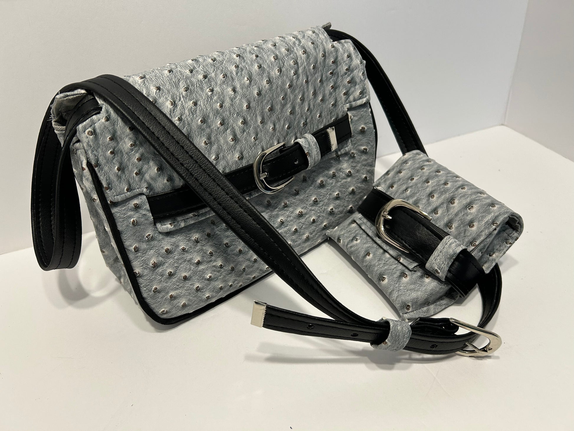 Cross Body bag made from faux leather embossed ostrich. The lining is waterproof canvas and features 2 slip pockets. The front flap closes with a magnetic snap. The mini matching bag can be worn on the cross body strap or on your own belt around your waist or just tuck it inside your bag.