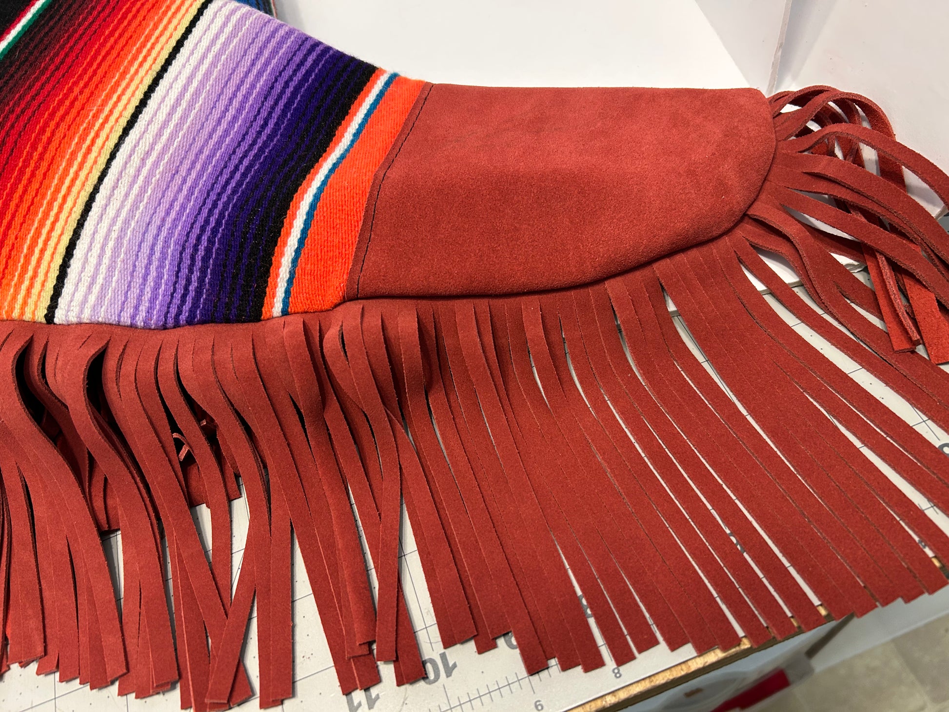 This rifle case is made from a blanket and suede leather on the outside and waterproof canvas on the inside. It measures 52" long with 6" fringe all down one side. A 6" leather covers the toe as well as the leather flap with a buckle closure. There is foam padding all around to help cushion your rifle.