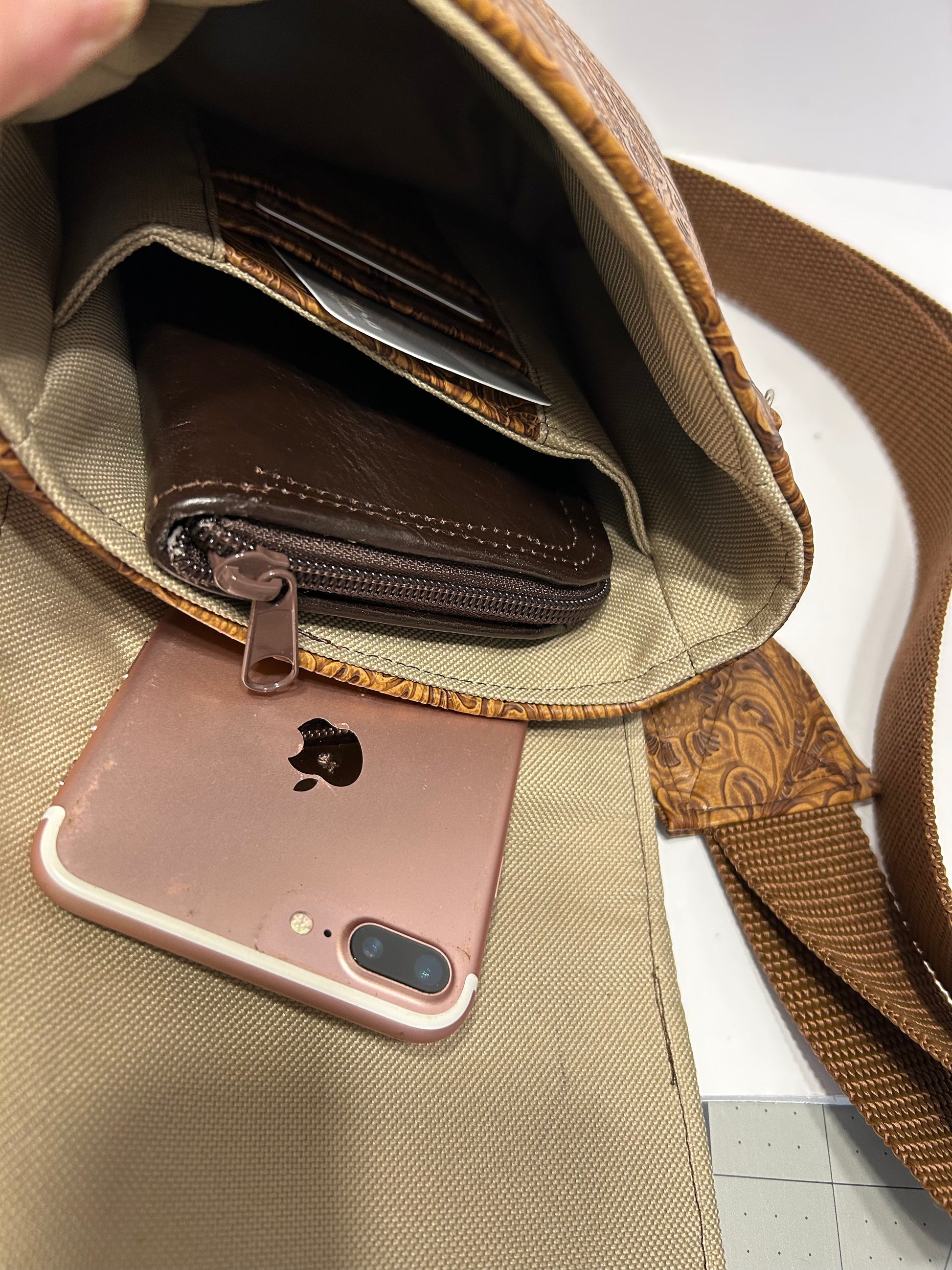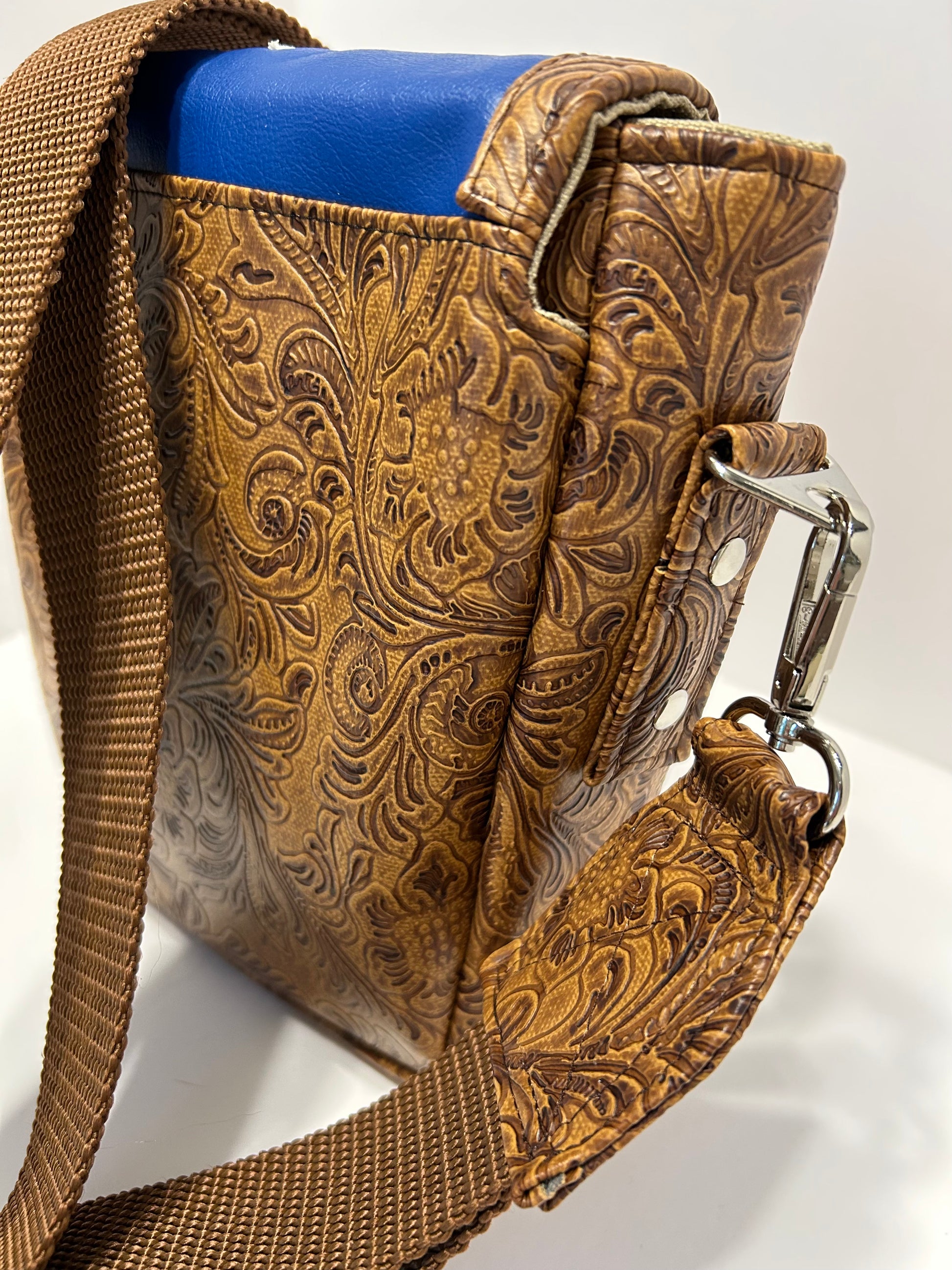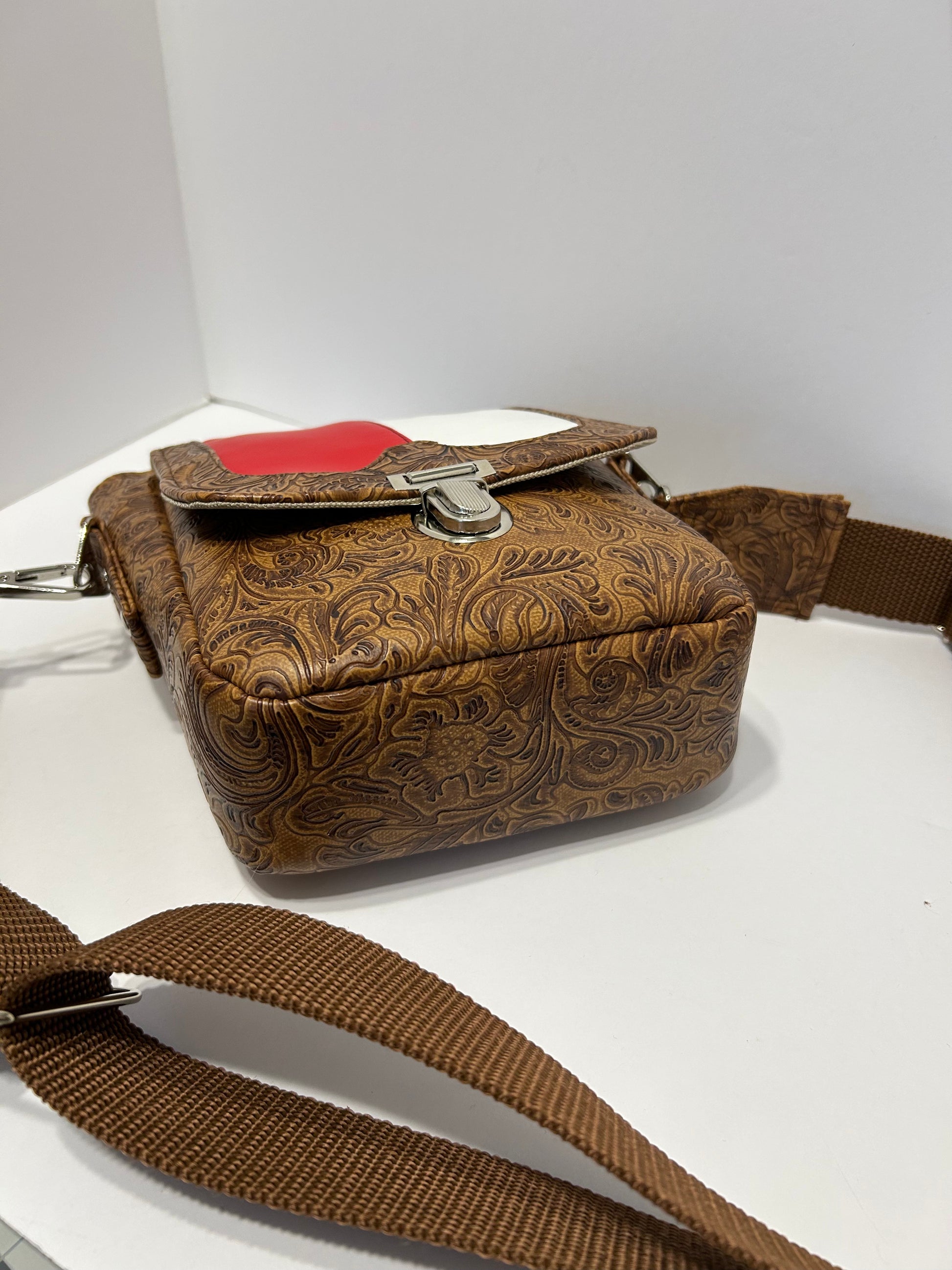 This bag is made from embossed faux leather on the outside with waterproof canvas on the inside. The front flap boasts the Texas Flag and closes with a thumb lock. The inside has 3 credit card slots and a deep slip pocket as well as a hidden slip pocket behind the flap. Comes with and adjustable crossbody strap.