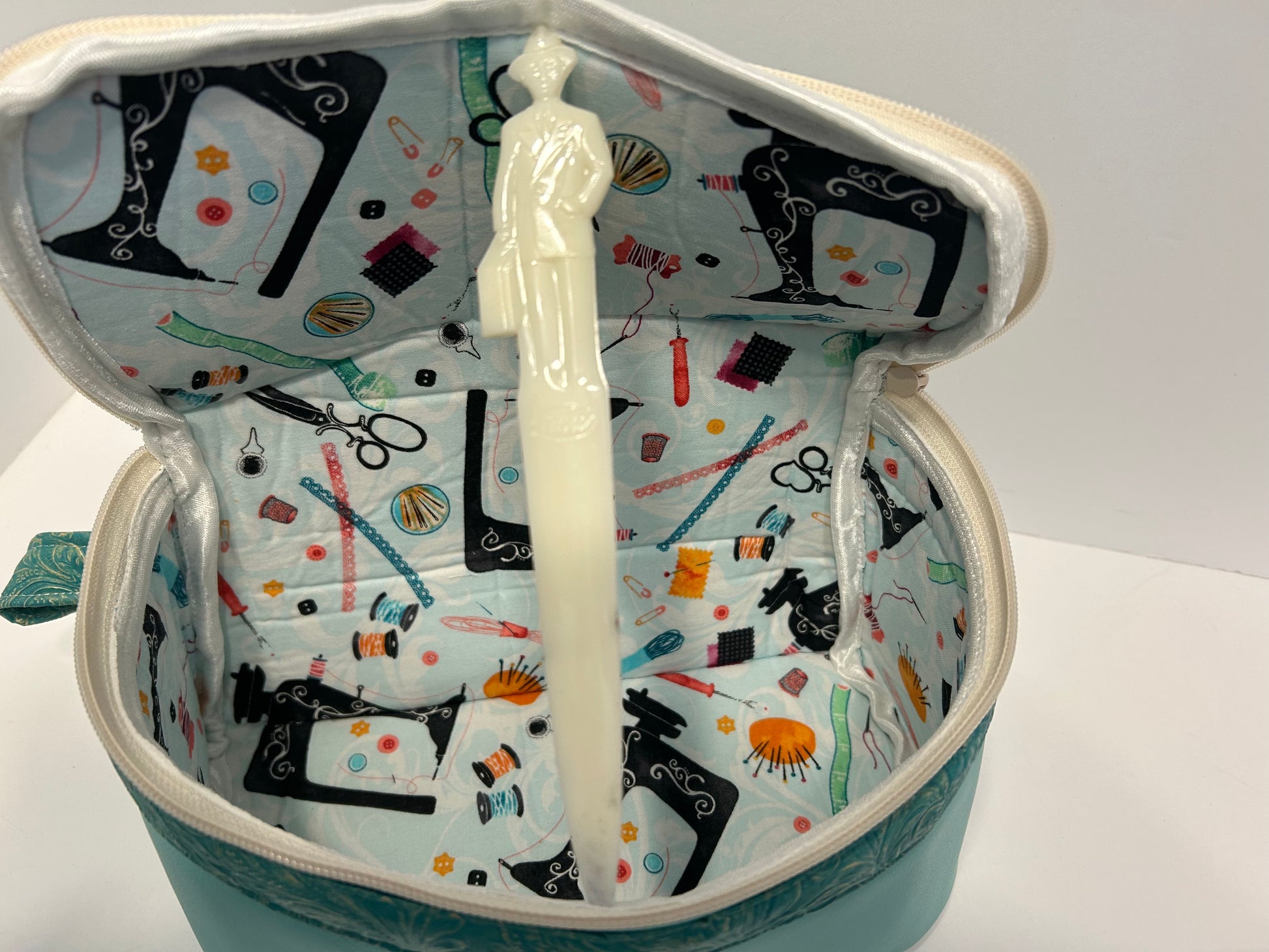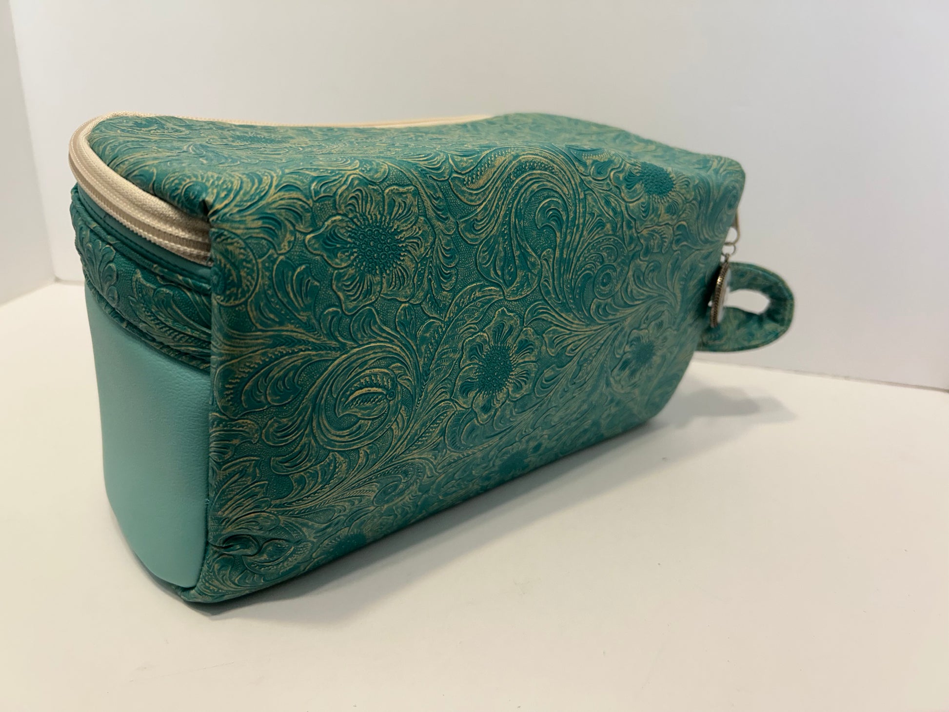 I made this bag from the Pixie pattern by Seams Legit. It measures 10 inches wide, 5 1/2 inches tall and 4 inches wide. The outside is a southwestern swirl designed vinyl with a solid vinyl accent. The inside is quilting cotton with a cotton binding. The top zips to close and has a handy carry tab on one side.